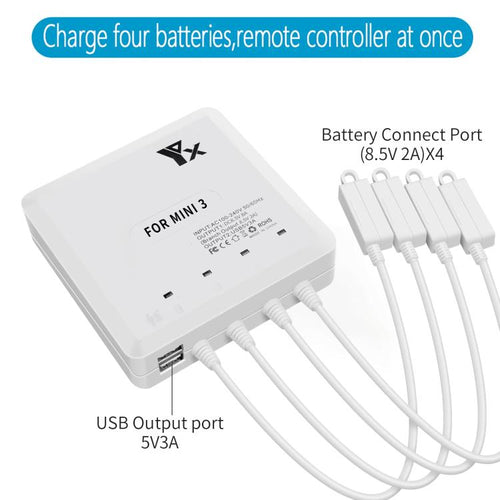 1. Compatible with 2453mAh standard battery and 3850mAh long-life battery of Mini 4/Mini 3 Pro, 4 batteries can be charged at the same time, 2 batteries of different capacities can also be charged at the same time, automatic identification (the product only has a charger but does not include a battery)