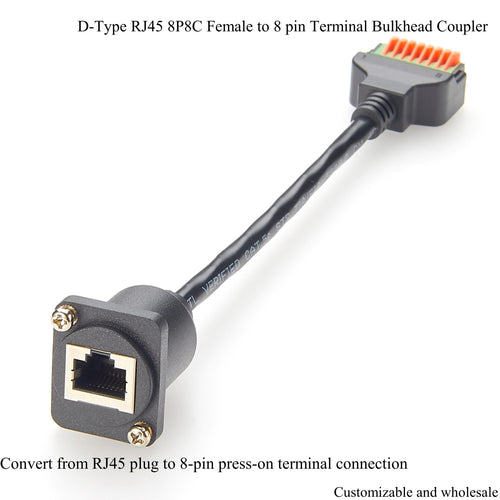 D-Type RJ45 Ethernet Female To 8 Pin Terminal Panel The D-Type RJ45 Ethernet Female To 8 Pin Terminal Panel Mount is a connector designed for industrial and commercial applications. It converts the standard RJ45 Ethernet interface into an 8-pin terminal connection, making it easy for users to wire and connect devices. The product integrates a D-panel mount design to ensure reliability and ease of use in a variety of environments.