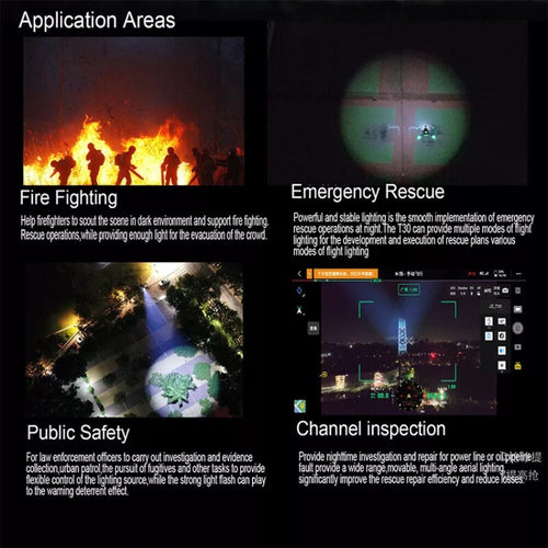 2. Rated power is 30W, it can emit a sharp beam at a 12.5-degree angle, with an effective search distance of 100 meters, uniform brightness, high color consistency, and effectively meet the needs of small drones for night patrols, direction indication, search and rescue and other application scenarios.
