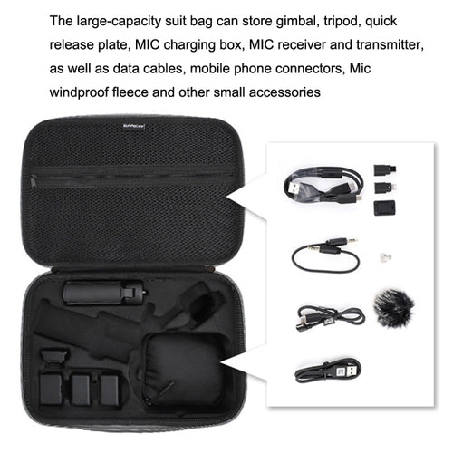 1. The large-capacity suit bag can store gimbal, tripod, quick release plate, MIC charging box, MIC receiver and transmitter, as well as data cables, mobile phone connectors, Mic windproof fleece and other small accessories